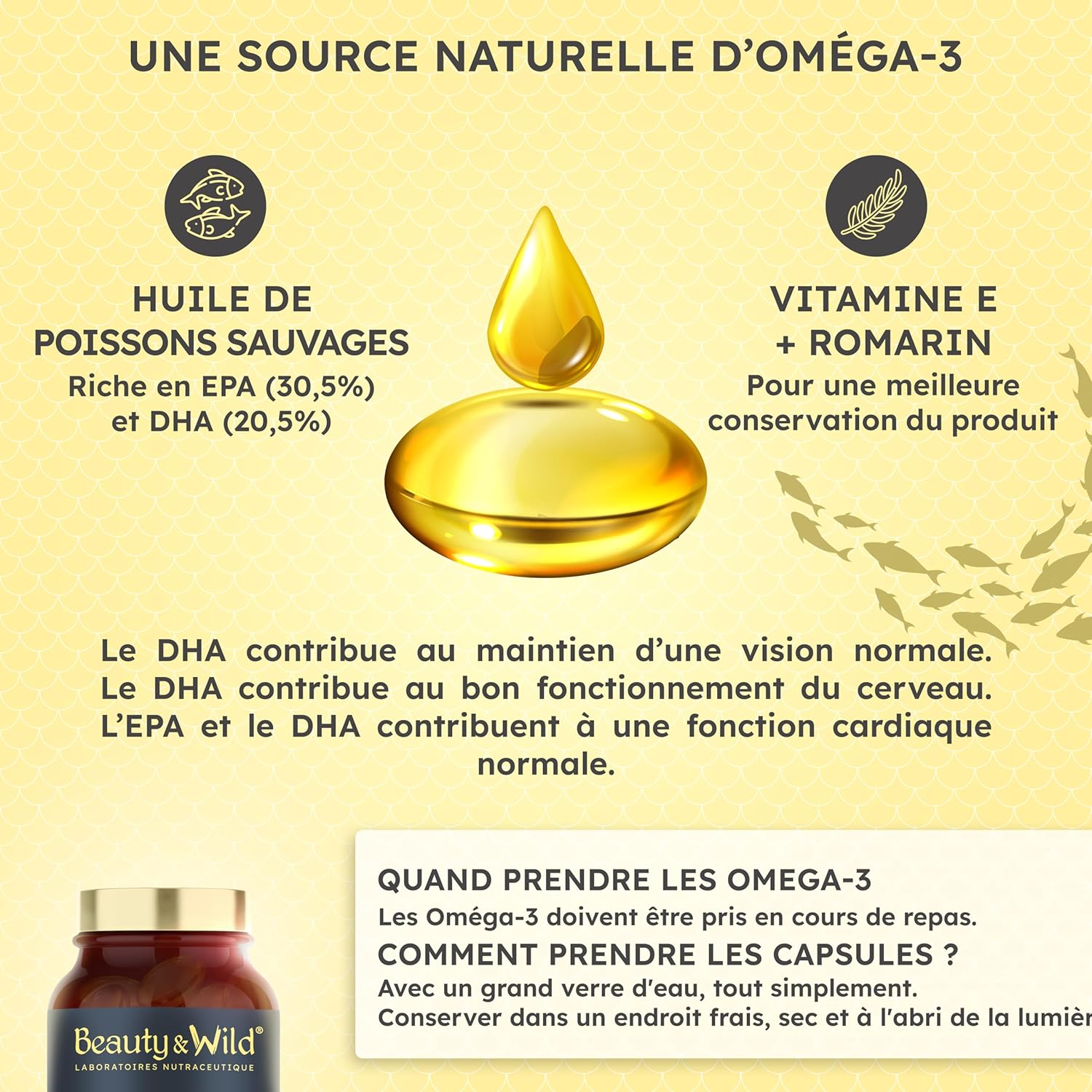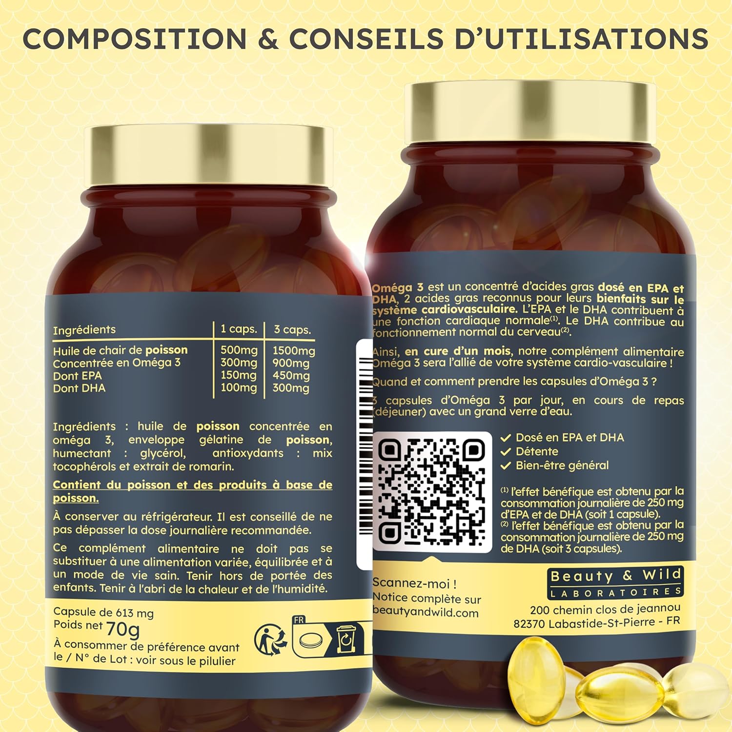 🏆 POURQUOI CHOISIR NOTRE COMPLEMENT D’OMÉGA 3 ? Fabriqué en France, nos capsules d’OMEGA 3 contiennent 2000mg d'huile de poissons qui fournissent pour 4 capsules 610mg d'EPA et 410mg de DHA pour 1200mg d'OMÉGA 3. Ces acides gras sont essentiels pour la santé du cœur et du cerveau.