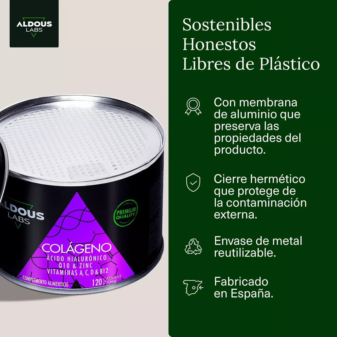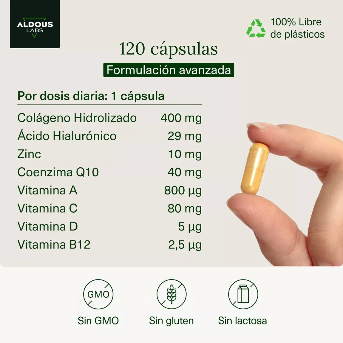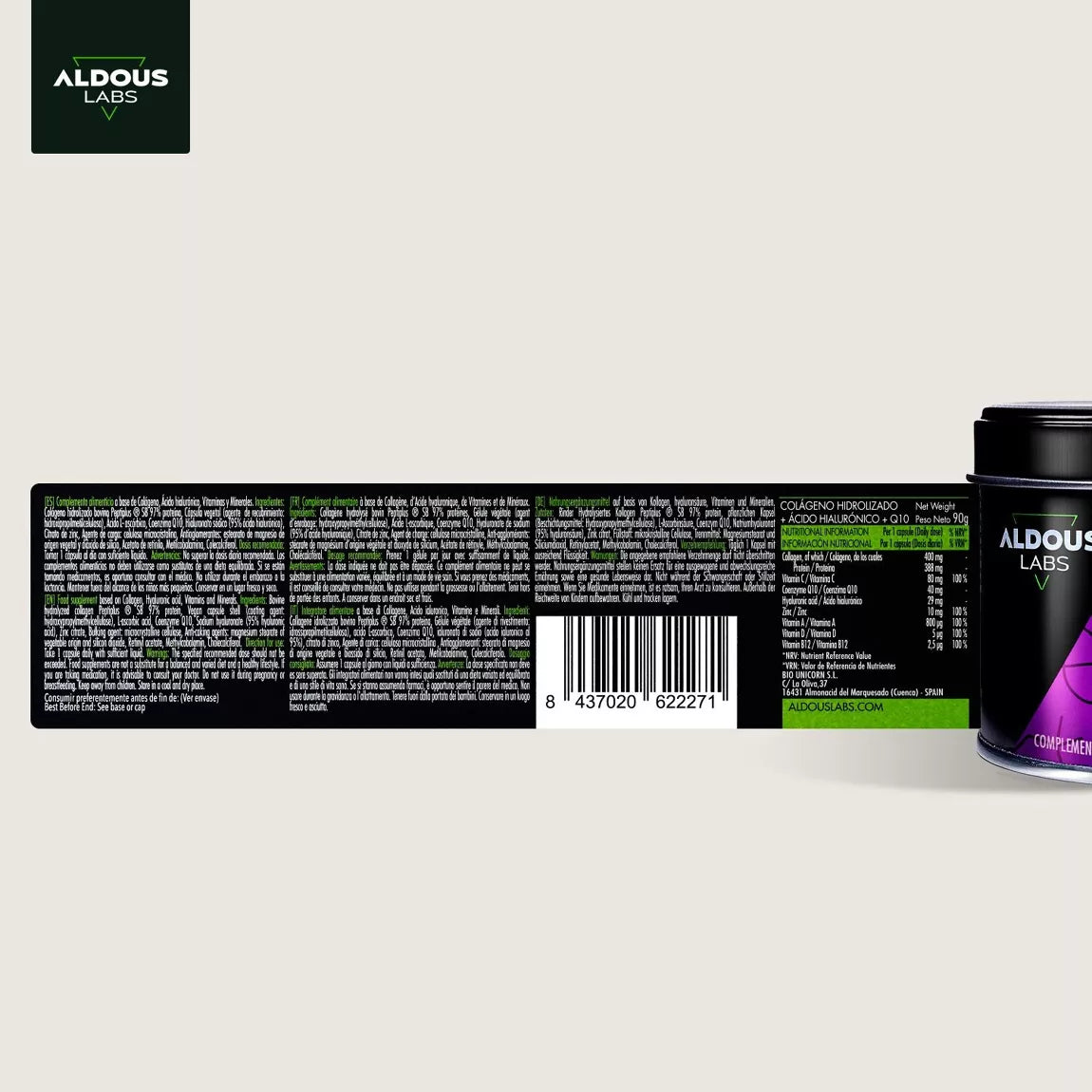 La formulation avancée d'Aldous combine du collagène bovin hydrolysé avec de l'acide hyaluronique, de la coenzyme Q10, des vitamines A, C, D, B12 et du zinc. Il se présente sous la forme d'un contenant de 120 gélules de 750 mg chacune. Aldous Collagène d'origine bovine est produit sans édulcorants ni arômes pour obtenir un produit de qualité pour la santé et les soins personnels et sans OGM. De plus, notre formulation est présentée sous forme de capsules qui assurent une absorption maximale et une digestion facile du produit.