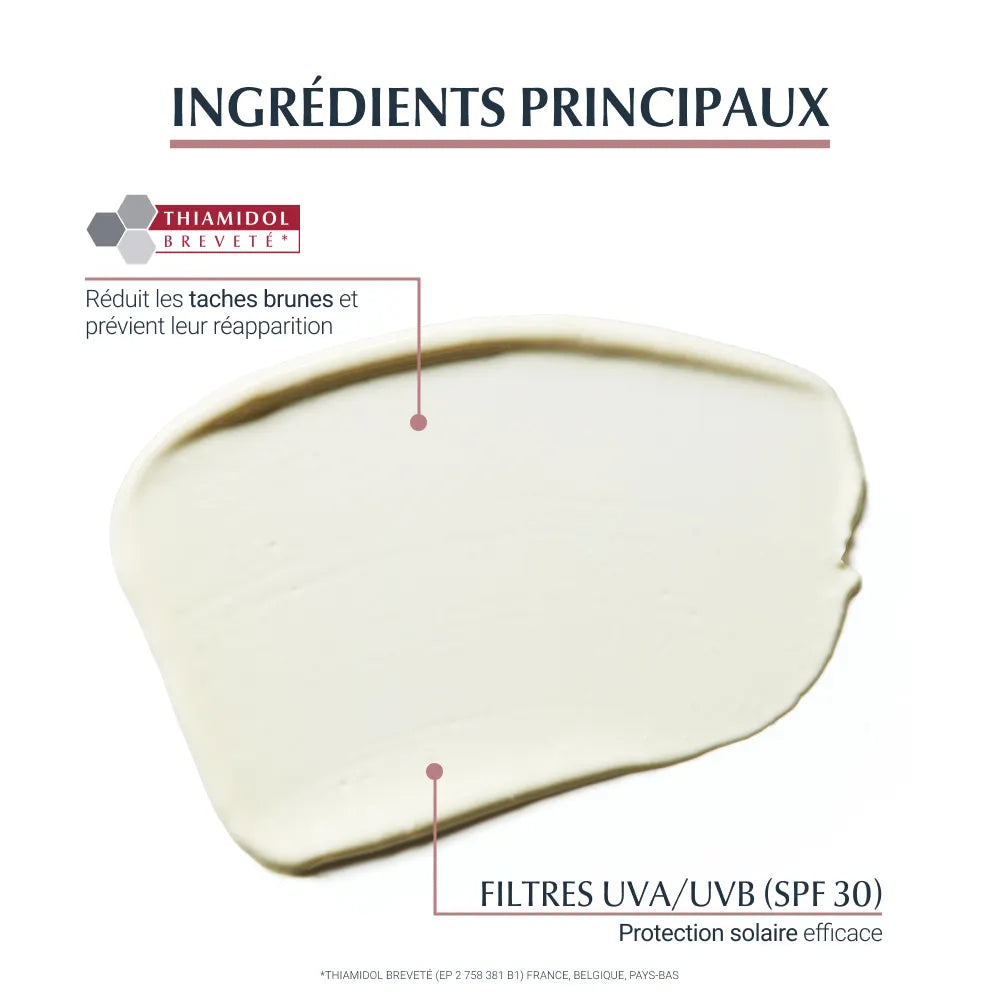 Eucerin ANTI-PIGMENT Soin de Jour SPF 30 contient du Thiamidol, un ingrédient efficace et breveté qui agit à la base de l'hyperpigmentation en réduisant la production de mélanine. Il est prouvé par des études cliniques et dermatologiques qu'il réduit les taches brunes et empêche leur réapparition. Les premiers résultats sont visibles après deux semaines et s'améliorent continuellement avec une utilisation régulière.