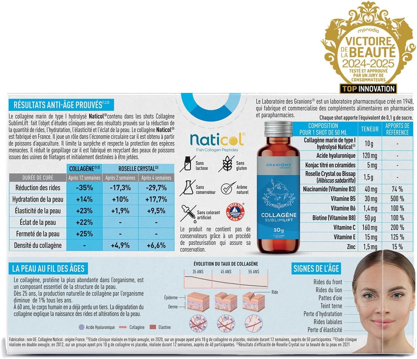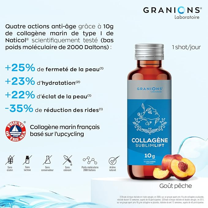 Le collagène marin de type I hydrolysé Naticol contenu dans les shots Collagène SublimLift fait l'objet d'études cliniques avec des résultats prouvés sur la réduciton de la quantité de rides, l'hydration, l'élasticité et l'éclat de la peau. Le collagène Naticol est fabriqué en France. Il joue un rôle dans l'économie circulaire car il est obtenu à partir de possons d'aquavulture. Il limite la surpêche et respecte la protection des esp_ces menacées. Il réduit le gaspillage car il est fabriqué en recyclant des peaux de poissons issues des usines de filetages et initialement destinées à être jetées.