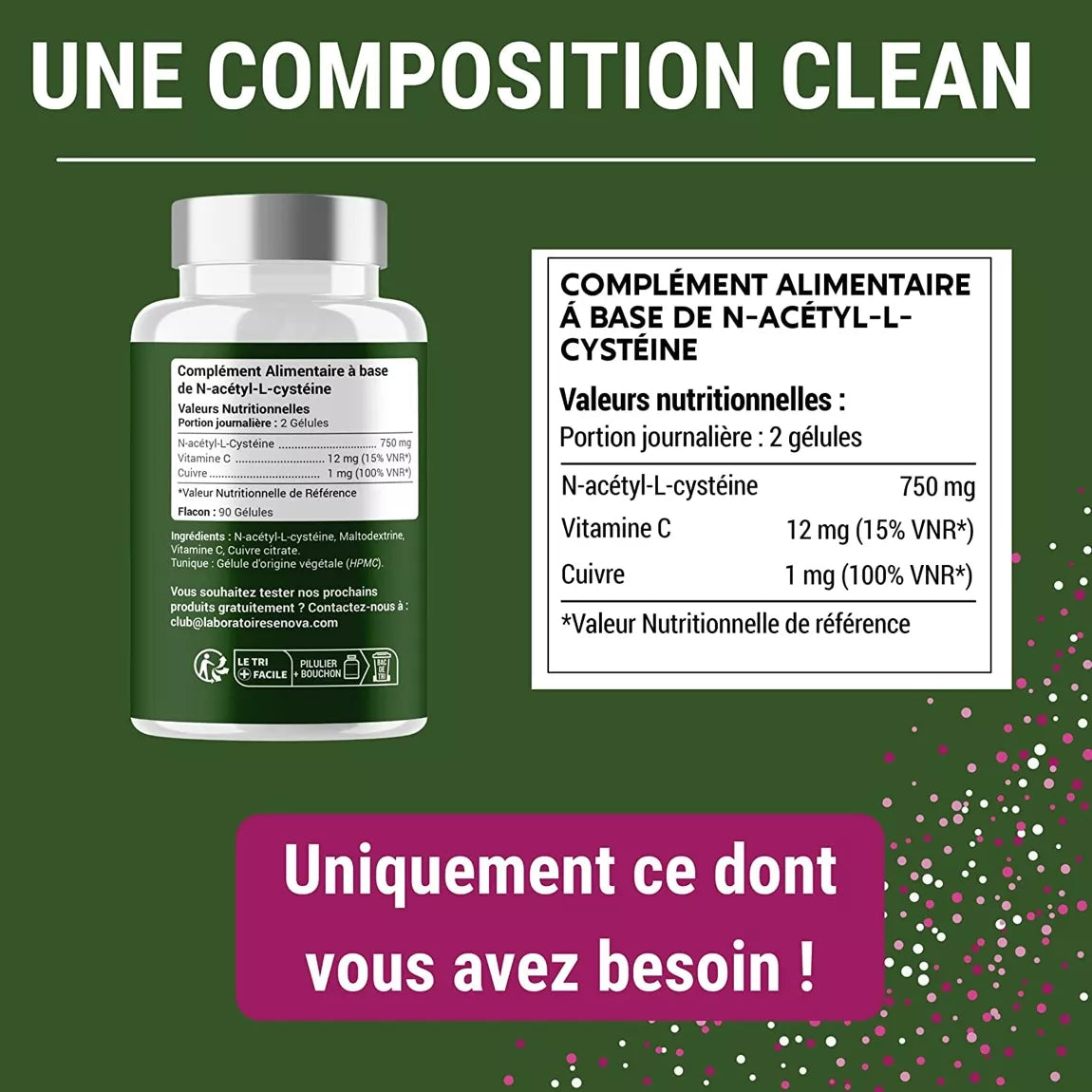 🌿 NAC (N-Acétyl-Cystéine) : dosage modulable avec 750 mg pour 2 gélules, une formule clean sans excipient controversé, meilleur rapport qualité-quantité-prix