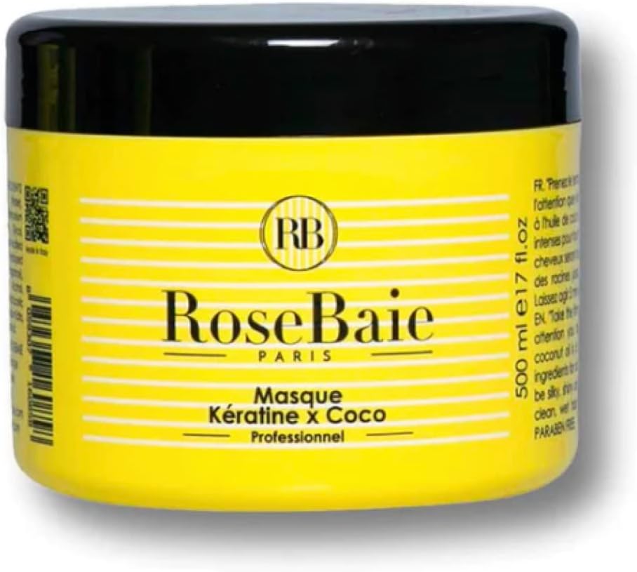Masque à la Kératine et à l’huile de Coco. Le masque RoseBaie à la kératine et à l’huile de coco est un ensemble d’actifs hydratants et fortifiants intenses pour tout type de cheveux.