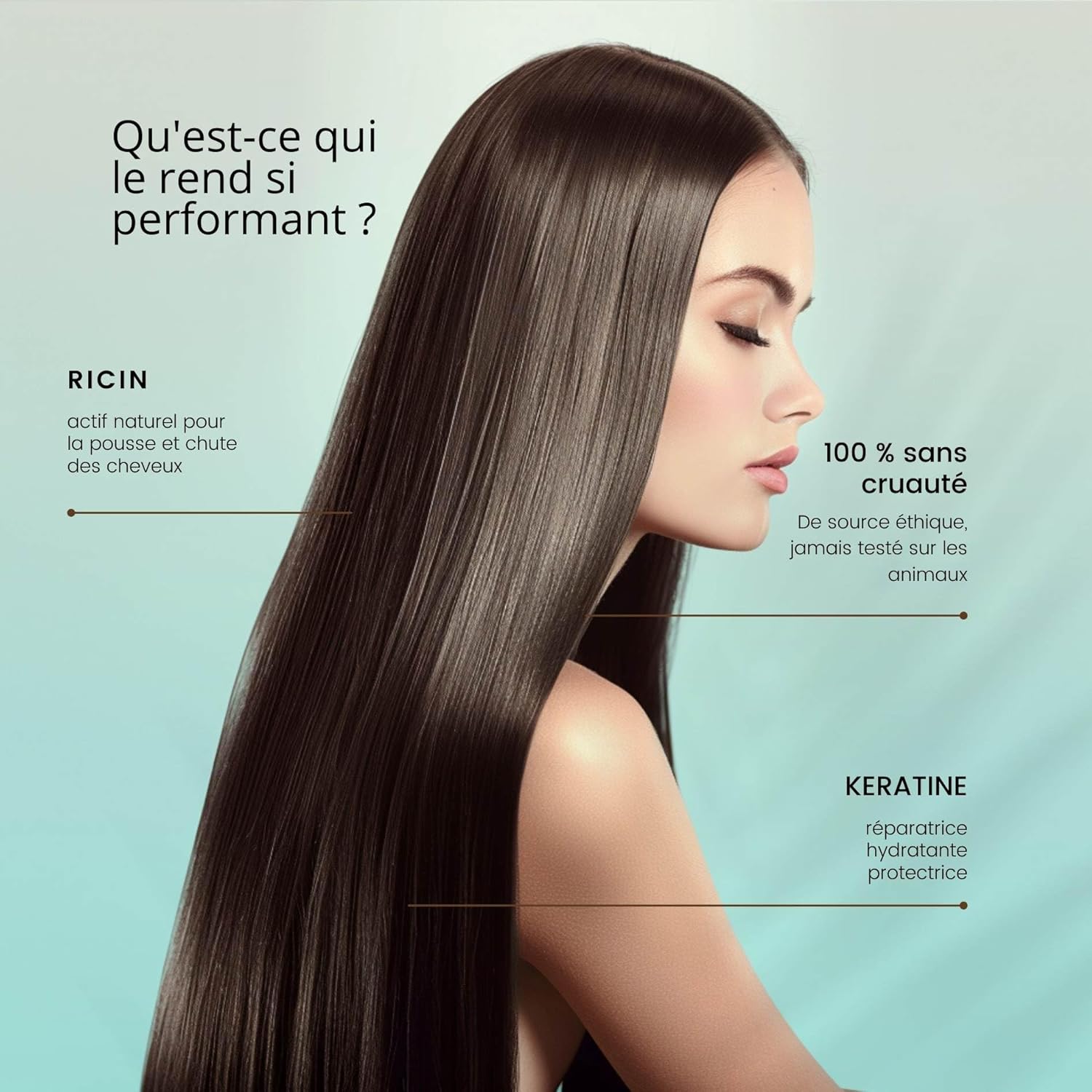 et stimule la fibre capillaire, hydrate et discipline afin de retrouver un éclat naturel. L’huile de ricin favorise la