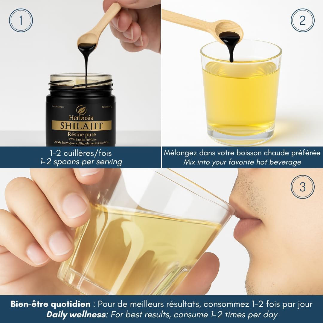 💡 Astuce : Prenez votre shilajit de préférence le matin ou en début d’après-midi pour profiter pleinement de son effet tonique.