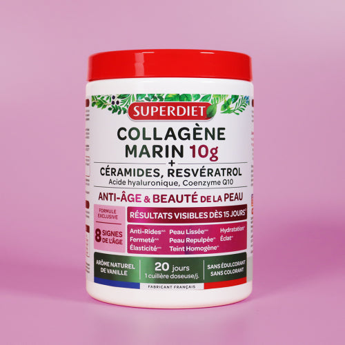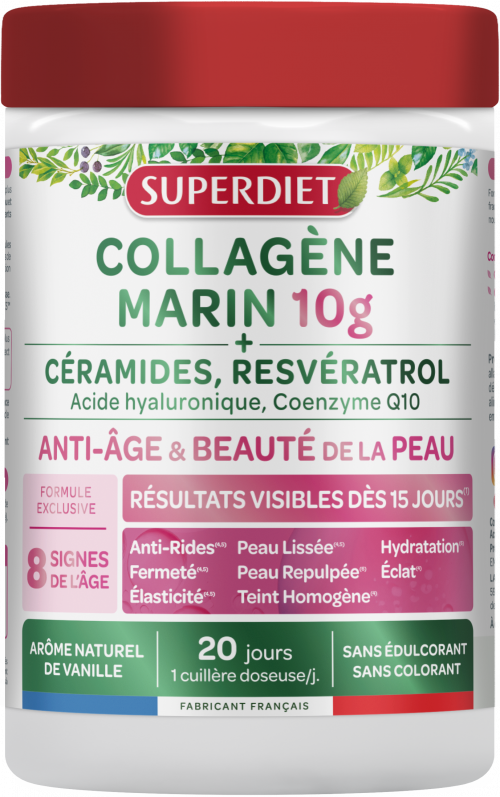 - Le Collagène améliore la fermeté et l'élasticité de la peau, réduit l'apparence des rides et ridules et rend le teint plus homogène et éclatant. SUPERDIET vous apporte chaque jour 10 g de peptides de Collagène marin hydrolysé NATICOL® de type I et III à faible poids moléculaire pour une assimilation favorisée.