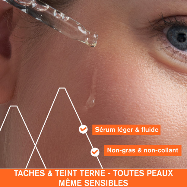 Actifs dermatologiques : [Mela Technology + 20% complexe Vitamine C + Niacinamide]