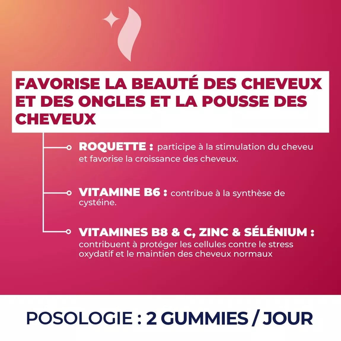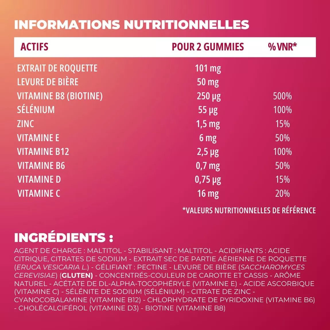*CROISSANCE : LA ROQUETTE PARTICIPE À LA STIMULATION DU BULBE DU CHEVEU ET FAVORISE LA POUSSE DES CHEVEUX. *BEAUTÉ : LE SÉLÉNIUM ET LE ZINC CONTRIBUENT AU MAINTIEN DE CHEVEUX ET D’ONGLES NORMAUX. LA VITAMINE B8 (BIOTINE) CONTRIBUE AU MAINTIEN DE CHEVEUX NORMAUX. *PROTECTION : LES VITAMINES C & E, LE SÉLÉNIUM ET LE ZINC CONTRIBUENT À PROTÉGER LES CELLULES CONTRE LE STRESS OXYDATIF. LA VITAMINE B6 CONTRIBUE À LA SYNTHÈSE NORMALE DE CYSTÉINE.