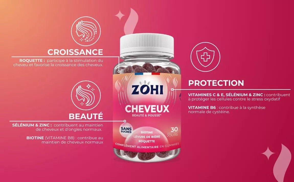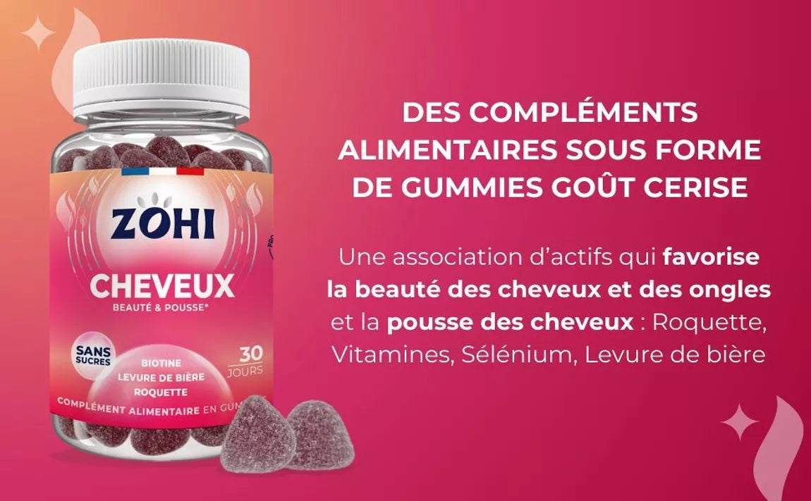 ZOHI CHEVEUX : Des compléments alimentaires sous forme de gummies goût cerise. Une association d'actifs qui favorise la pousse et la beauté des cheveux.