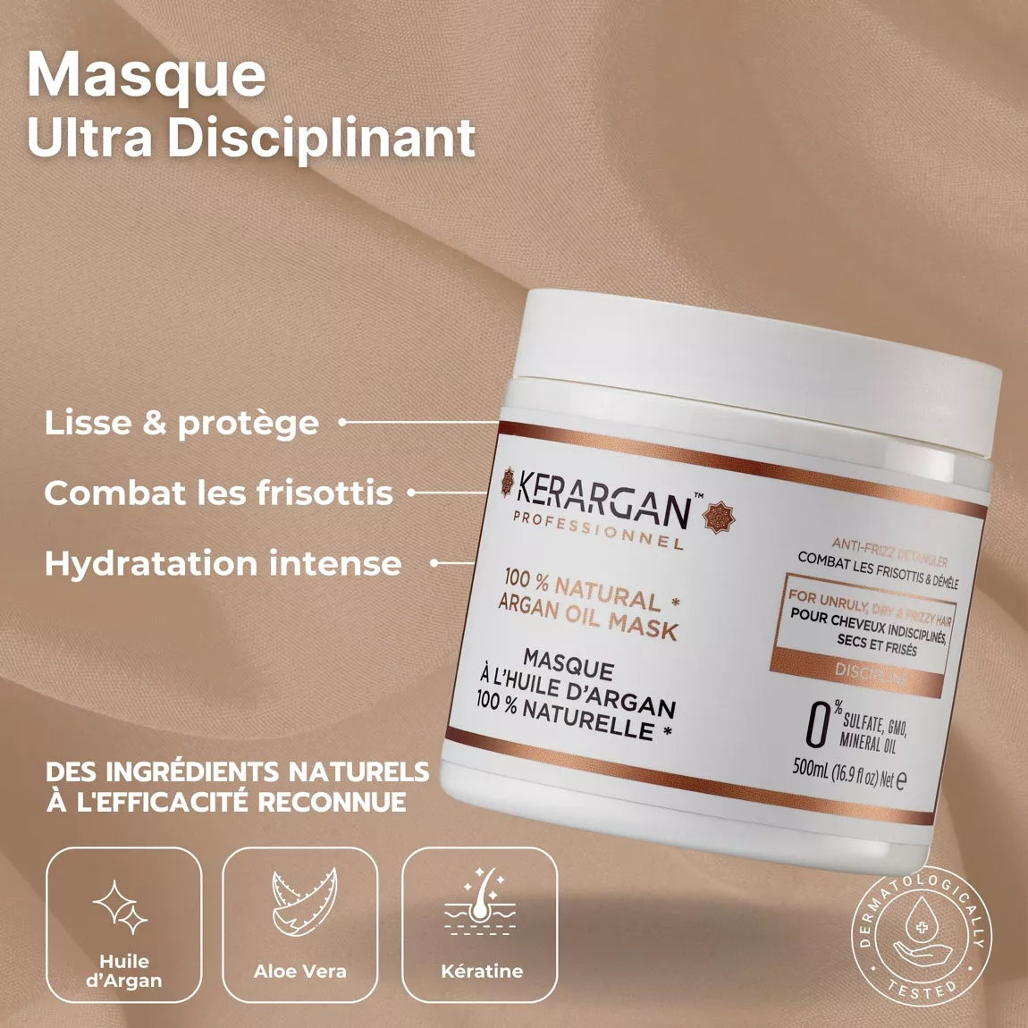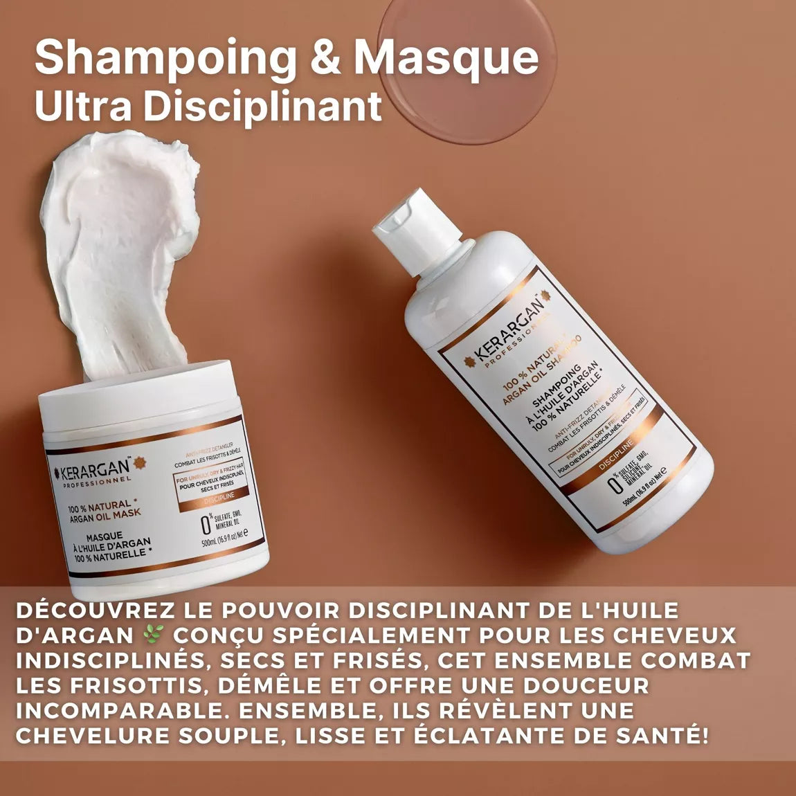 - Shampoing à l'Huile d'Argan (500ml) : Nettoie en douceur tout en disciplinant vos cheveux. Enrichi en aloe vera et kératine, il combat les frisottis, démêle et laisse une sensation de douceur incomparable.