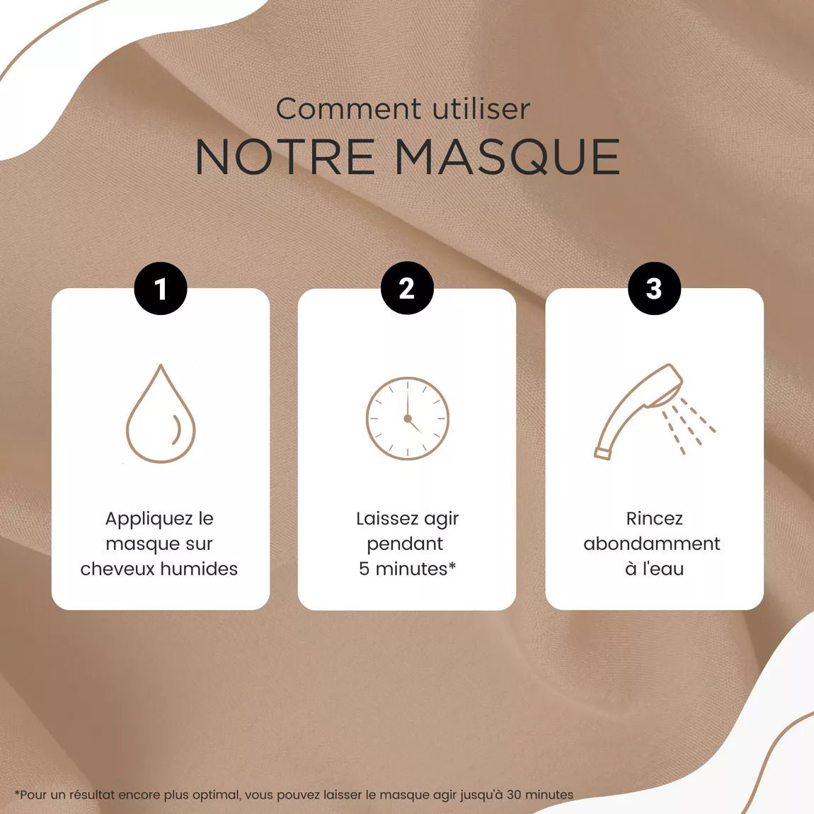 Appliquez le masque sur les cheveux humides sur toute leur longueur. Laissez agir 5 à 10 minutes puis rincez soigneusement avec de l'eau.