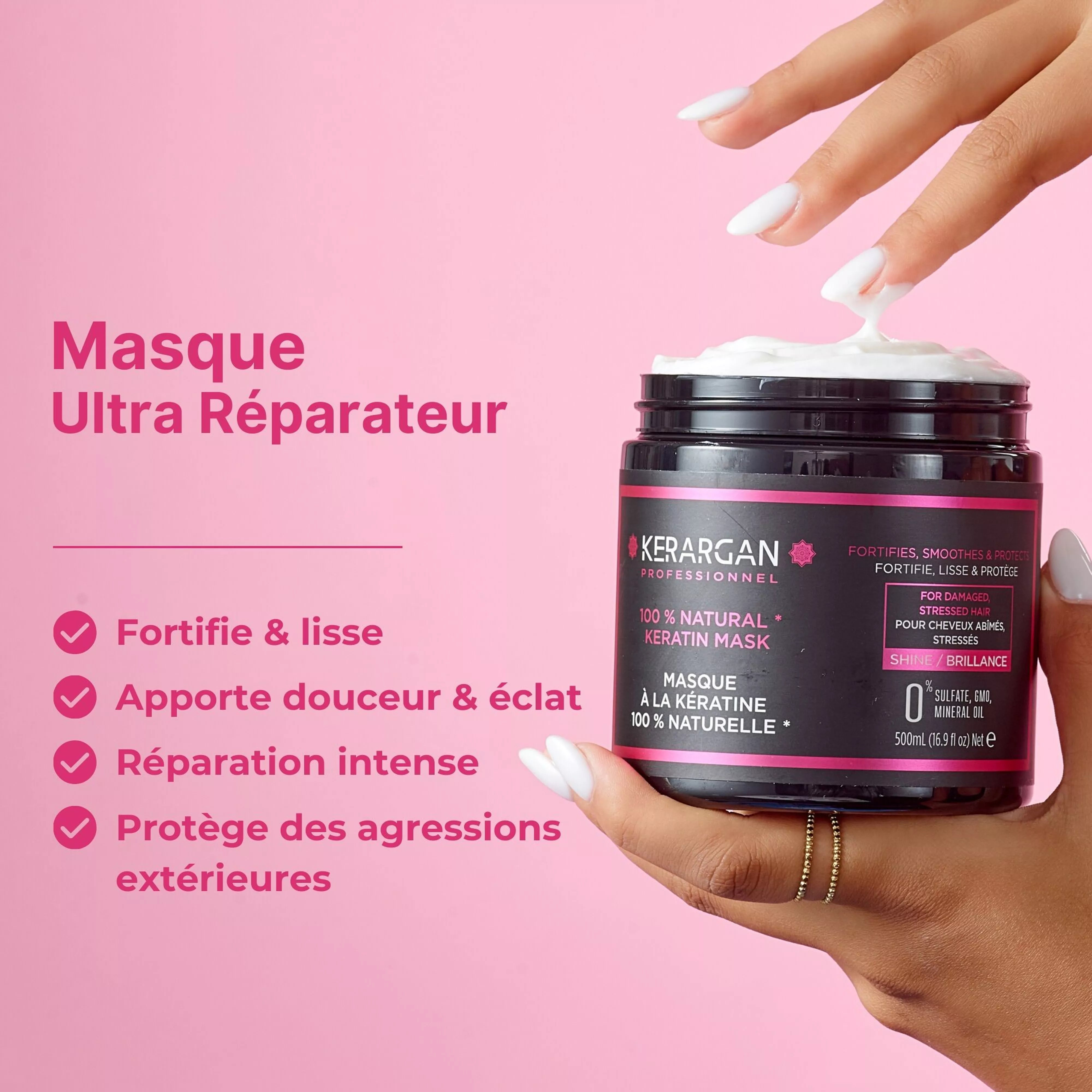 Chaque cheveu raconte une histoire. Pour ceux qui ont subi stress, agressions et dommages, le Masque Kerargan à la Kératine offre une nouvelle chance de briller. Ce soin profond infuse chaque mèche de vos précieux cheveux avec la puissance réparatrice de la kératine et les bienfaits nourrissants de l'huile d'argan et de l'aloe vera. 🌱🌟