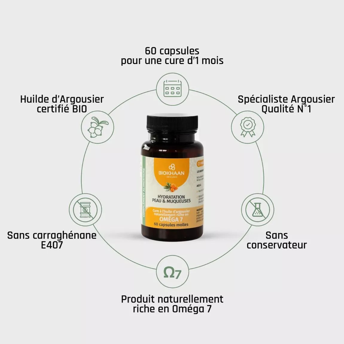 Notre complément alimentaire à l’huile d’argousier BIO est spécialement conçu pour hydrater la peau et les muqueuses en profondeur. Naturellement riche en Oméga 7, un acide gras rare, il favorise la régénération cellulaire, réduit la sécheresse cutanée et apaise les inconforts des muqueuses (bouche, yeux, zones intimes, etc.).